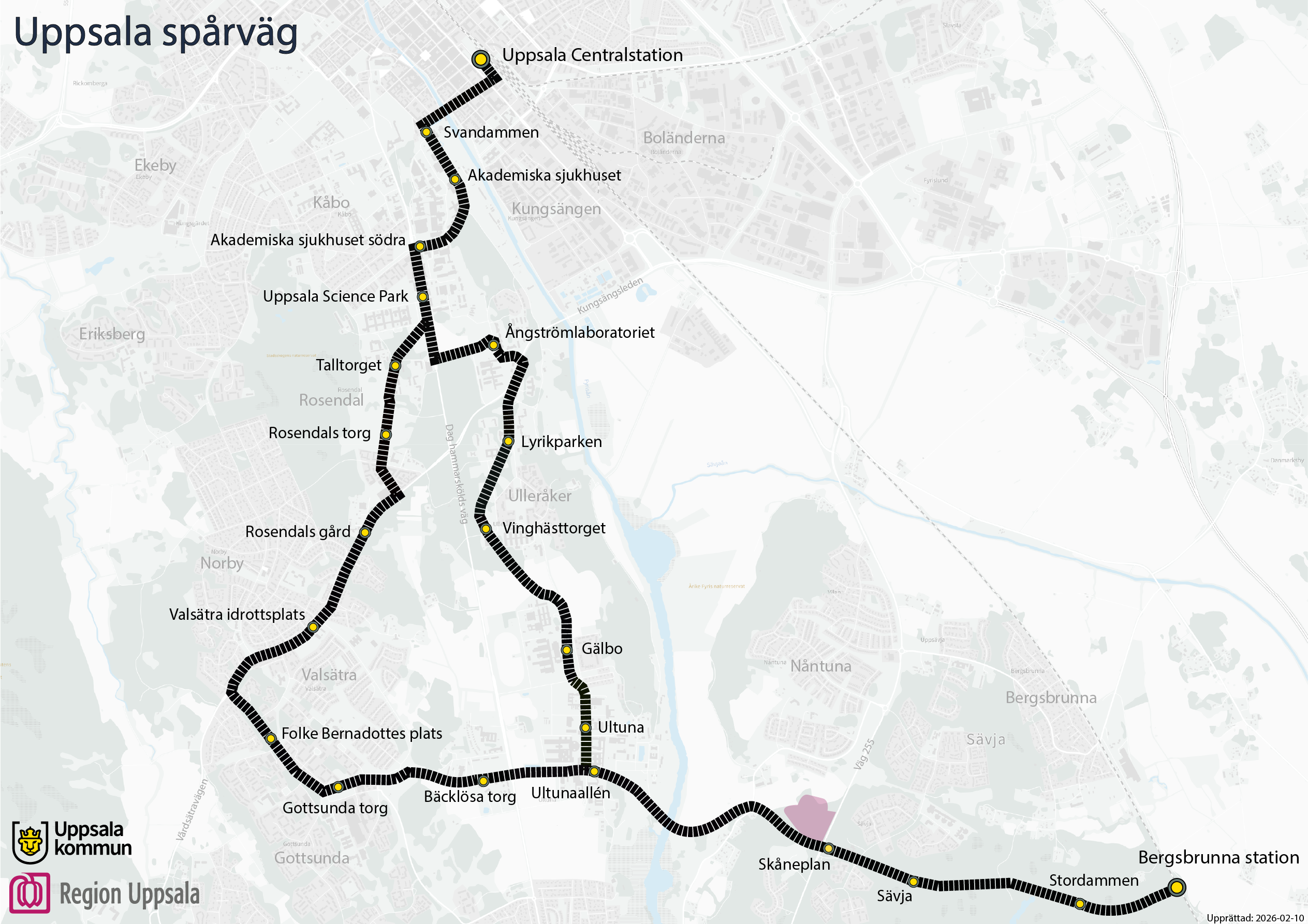 Spårvägen kommer att passera flera bostadsområden, arbetsplatser, skolor och naturområden i södra uppsala. Med den 17 kilometer långa spårvägen och de 22 hållplatserna samt bron över Fyrisån i höjd med Ultuna binds Uppsala ihop på ett nytt sätt.